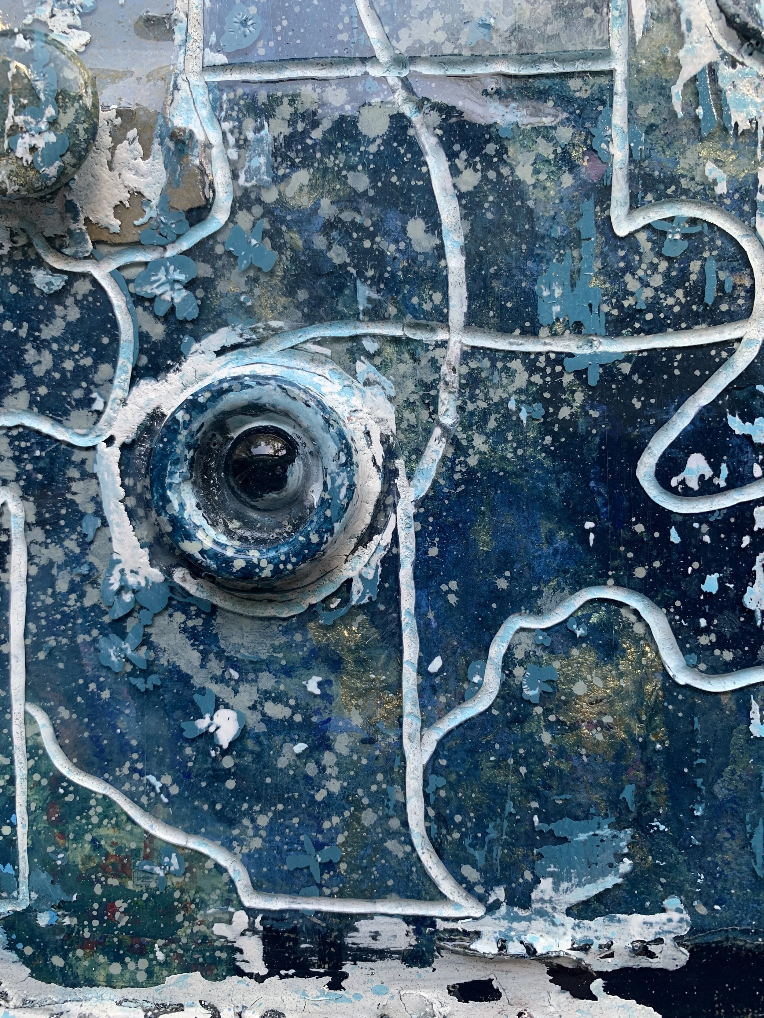 Then came the fun part: the carving. Using a Dremel, winding paths and puzzle-like lines were etched across the surface, weaving through the collage like tiny roads connecting the past to the present. Some paths lead to little pockets of found objects, others spiral into abstract shapes that look like gears, portals, or maybe just playful mischief.