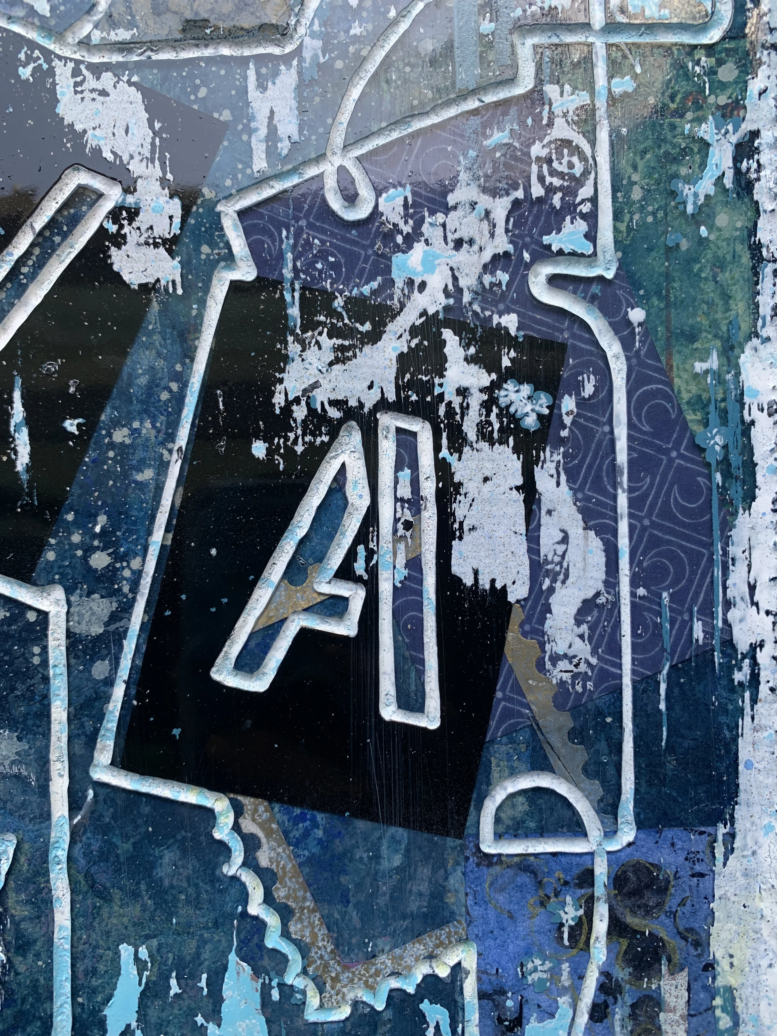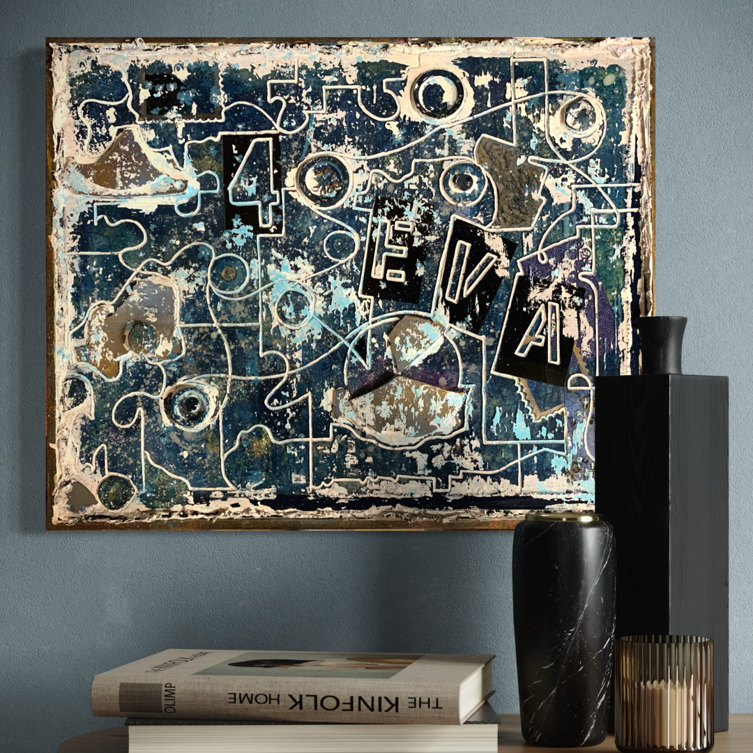 The surface has a weathered, time-traveled look—deep ocean blues, worn ivory edges, and splashes of texture that feel like they’ve lived a few lifetimes already. Letters drift across the scene like clues in a scavenger hunt, inviting viewers to invent their own stories about what they mean.