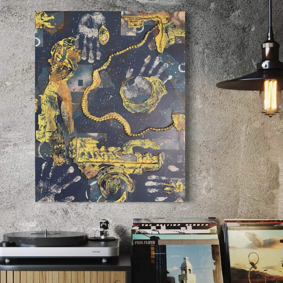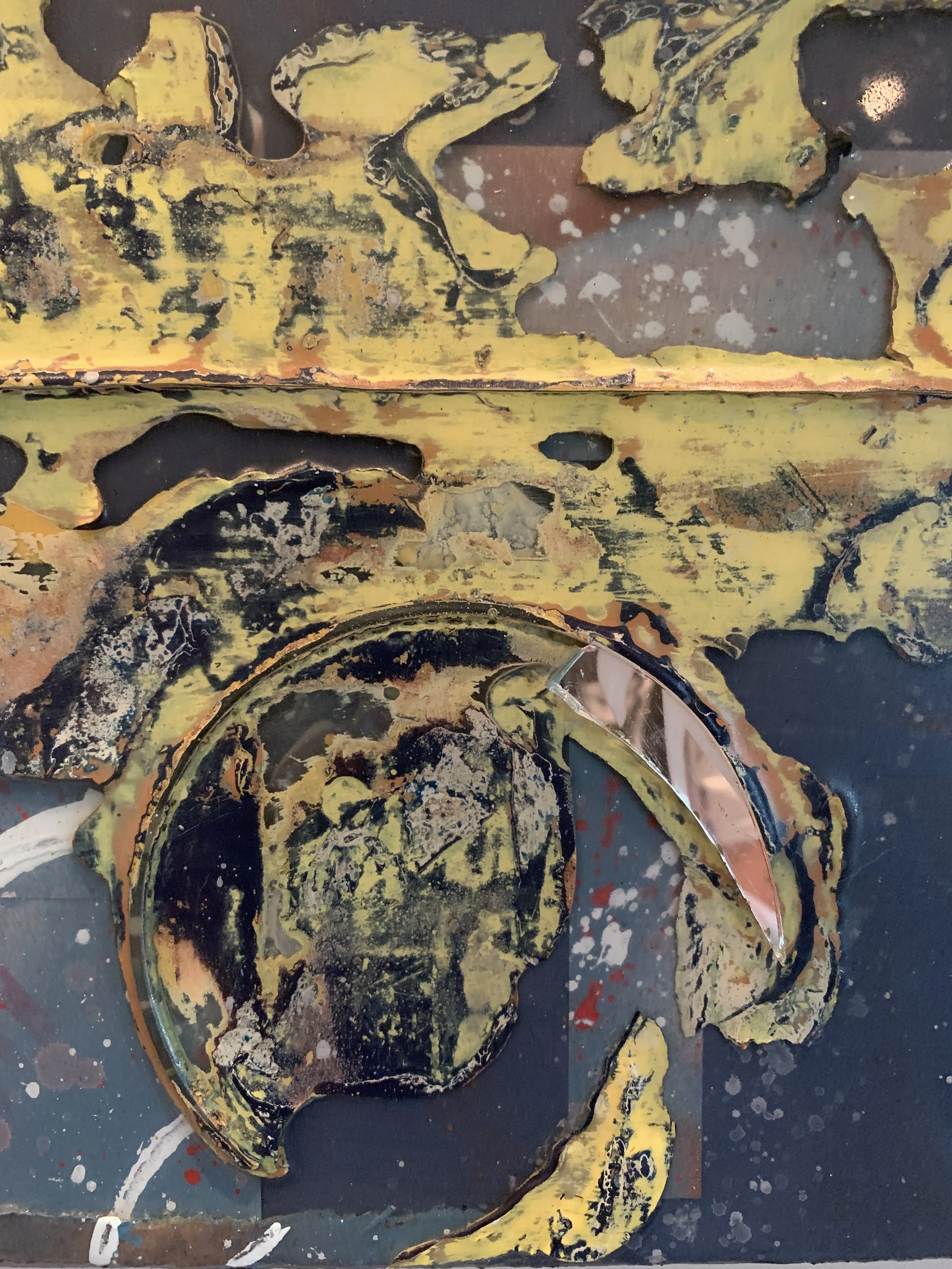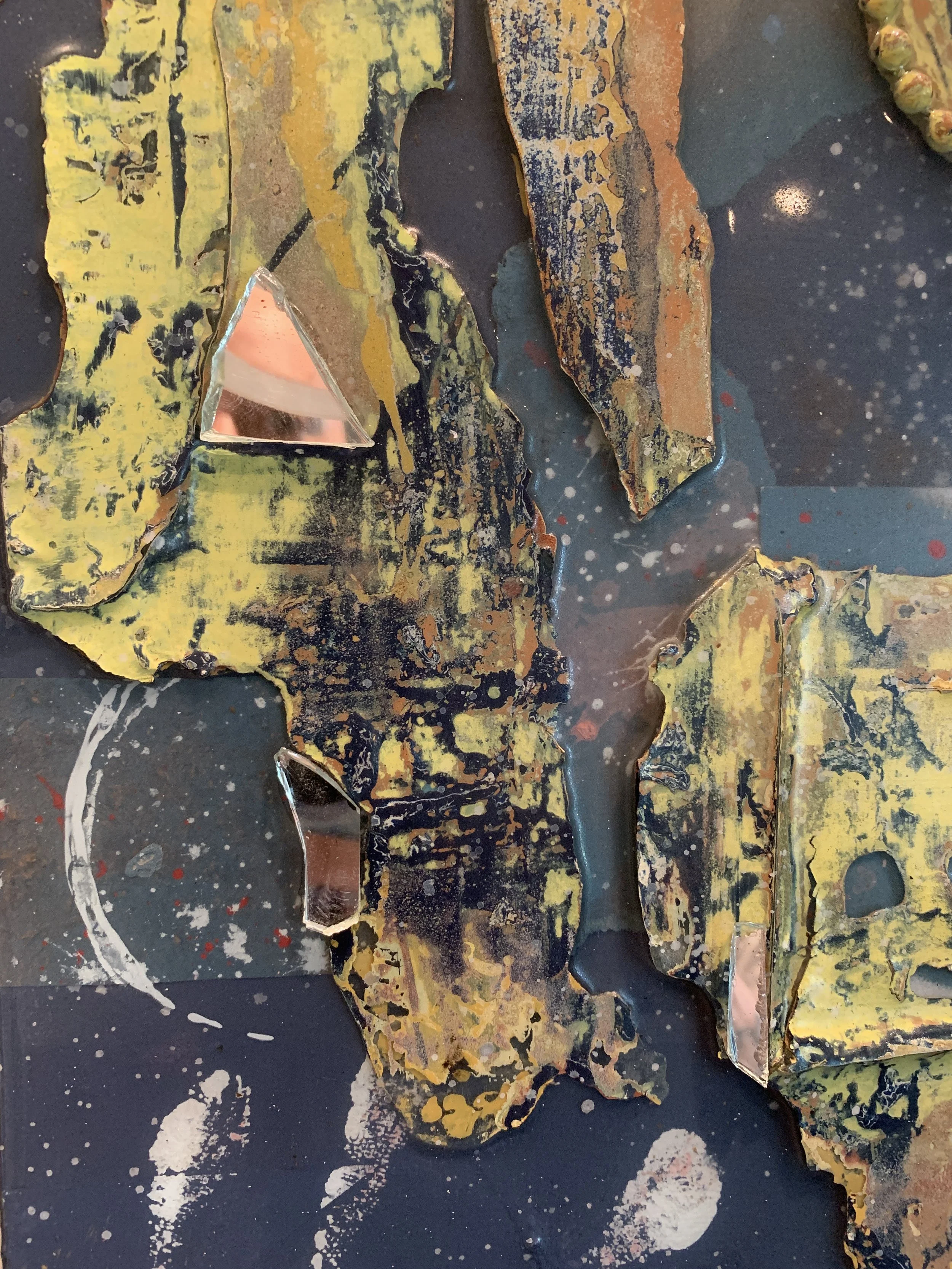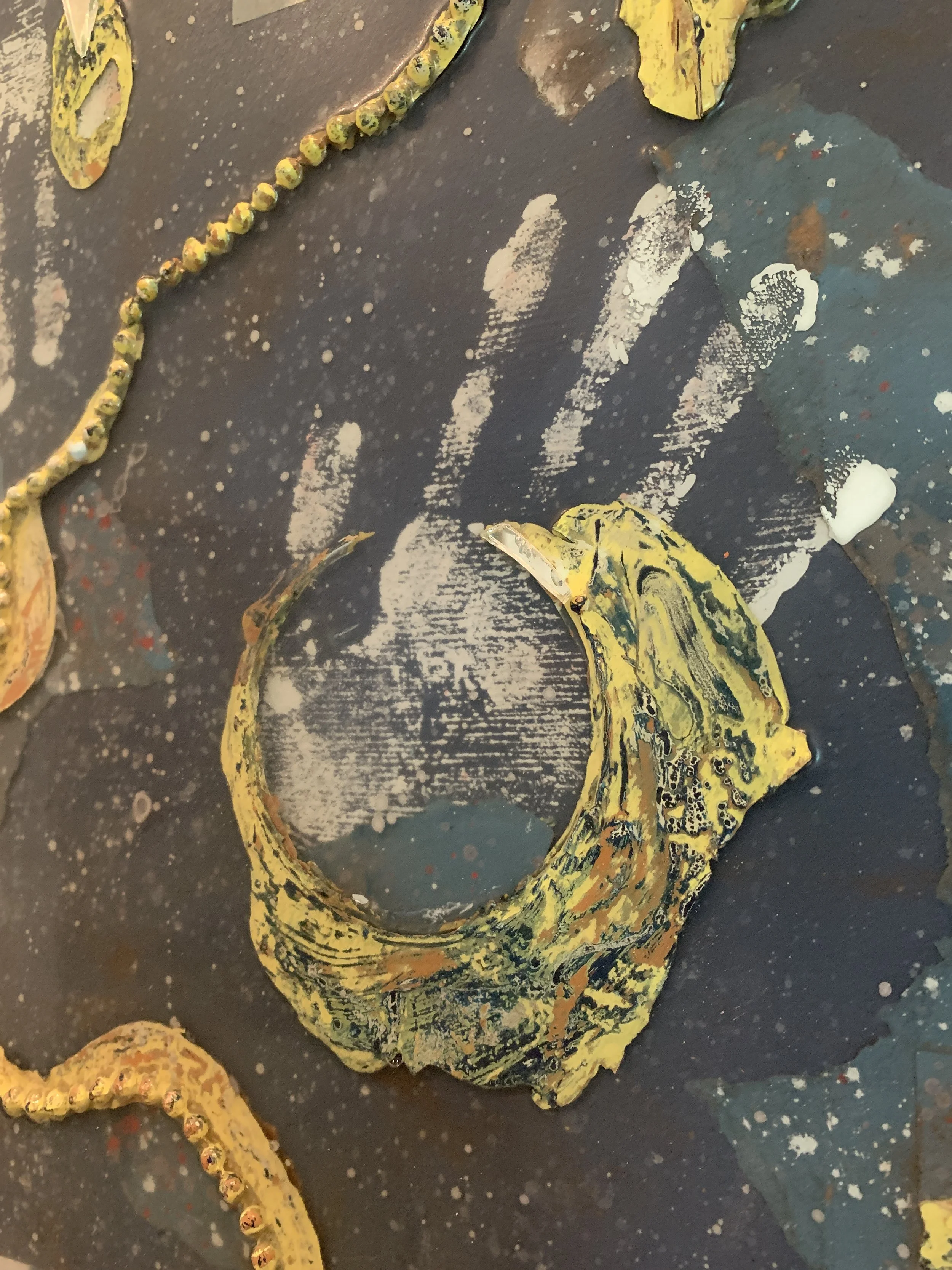 The painted resin texture that I pulled off the canvas that became Strata went into this piece, and somehow what wasn’t working for the other one absolutely fit the direction I was already headed in here. The inversion aspect of what one would expect to be the background texture in the foreground, and the ghostly hand-prints behind that gives it a raw vulnerability in my opinion. This piece is also part of my urban inspired series because the texture is so gritty and worn. It feels like parts of an abandoned building, and it grounds the polarity of what one could view as a celestial backdrop. In my mind however, it is not an otherworldly context… it is the static and kinetic kind of energy of being part of a scene, of having your finger on the pulse.