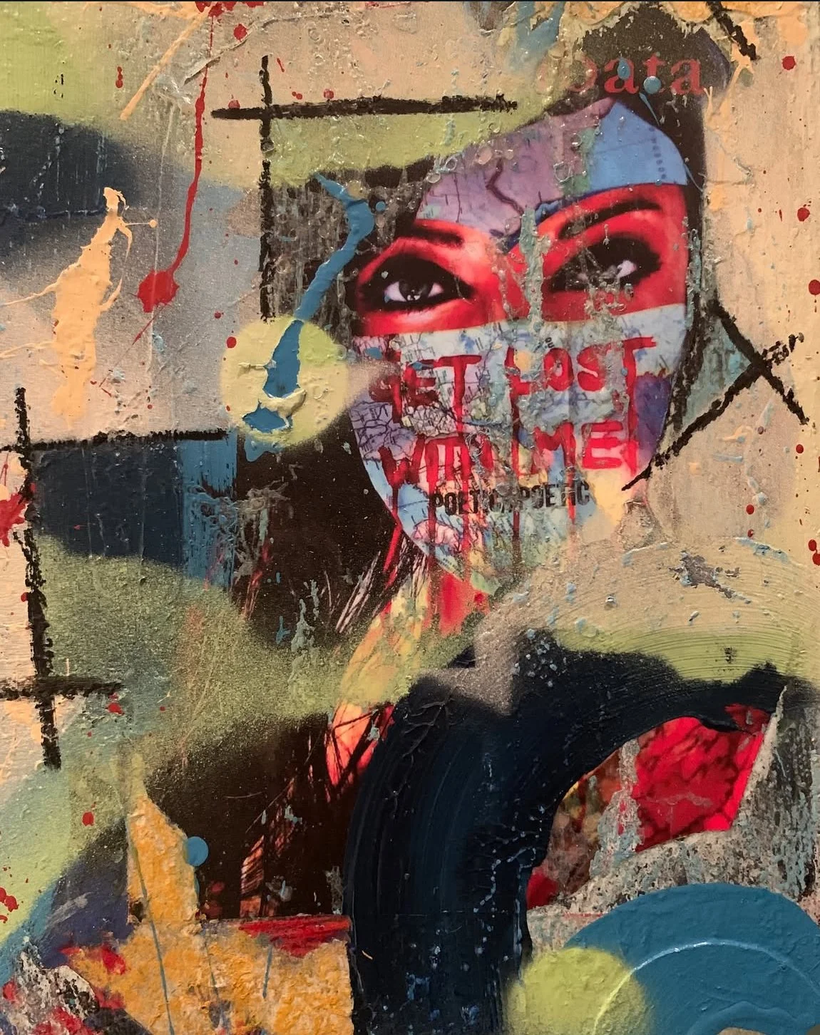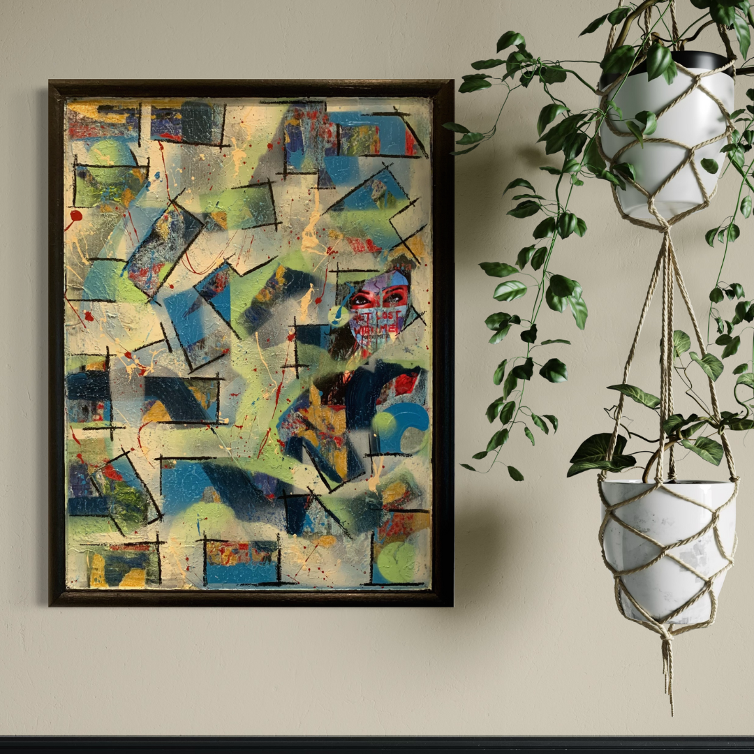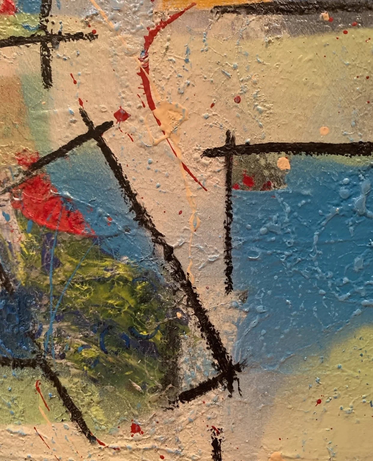 This piece is meant to invite you into a world that is slightly obscured, but visible enough you want to jump into its playful chaos… into the electricity of an abstract hedge maze or labyrinth of the charcoal outlines.