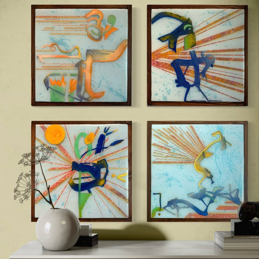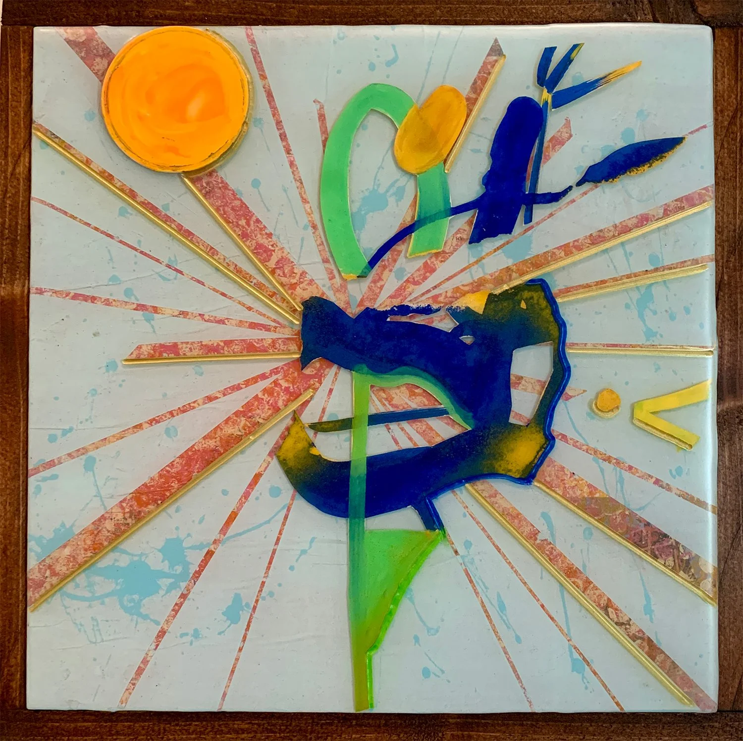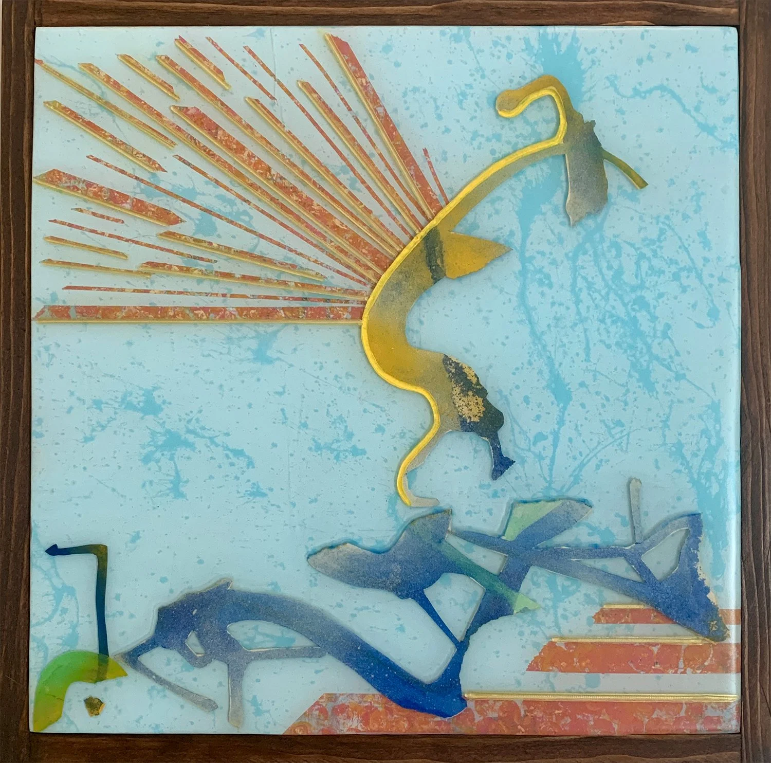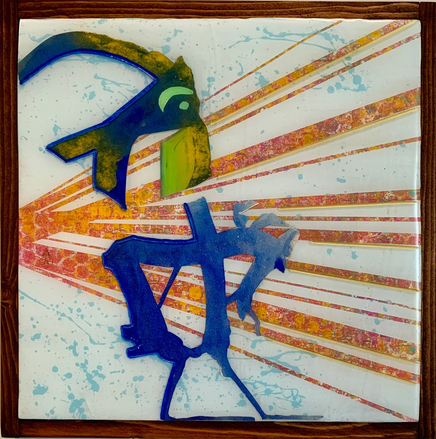 This series is a rearrangement / reconfiguration of abstract shapes cut out from my sketchbook. I then mounted them between layers of resin and top of painted maps to tell a story. The collection uses four distinct panels, each (13" x13") titled with pieces of familiar "proverbs" to dissect how these simple maxims, learned in childhood, become an internalized "lore" that guides our adult lives. These abstract figures created from my sketchbook scraps almost take the form of petroglyph-like symbols.