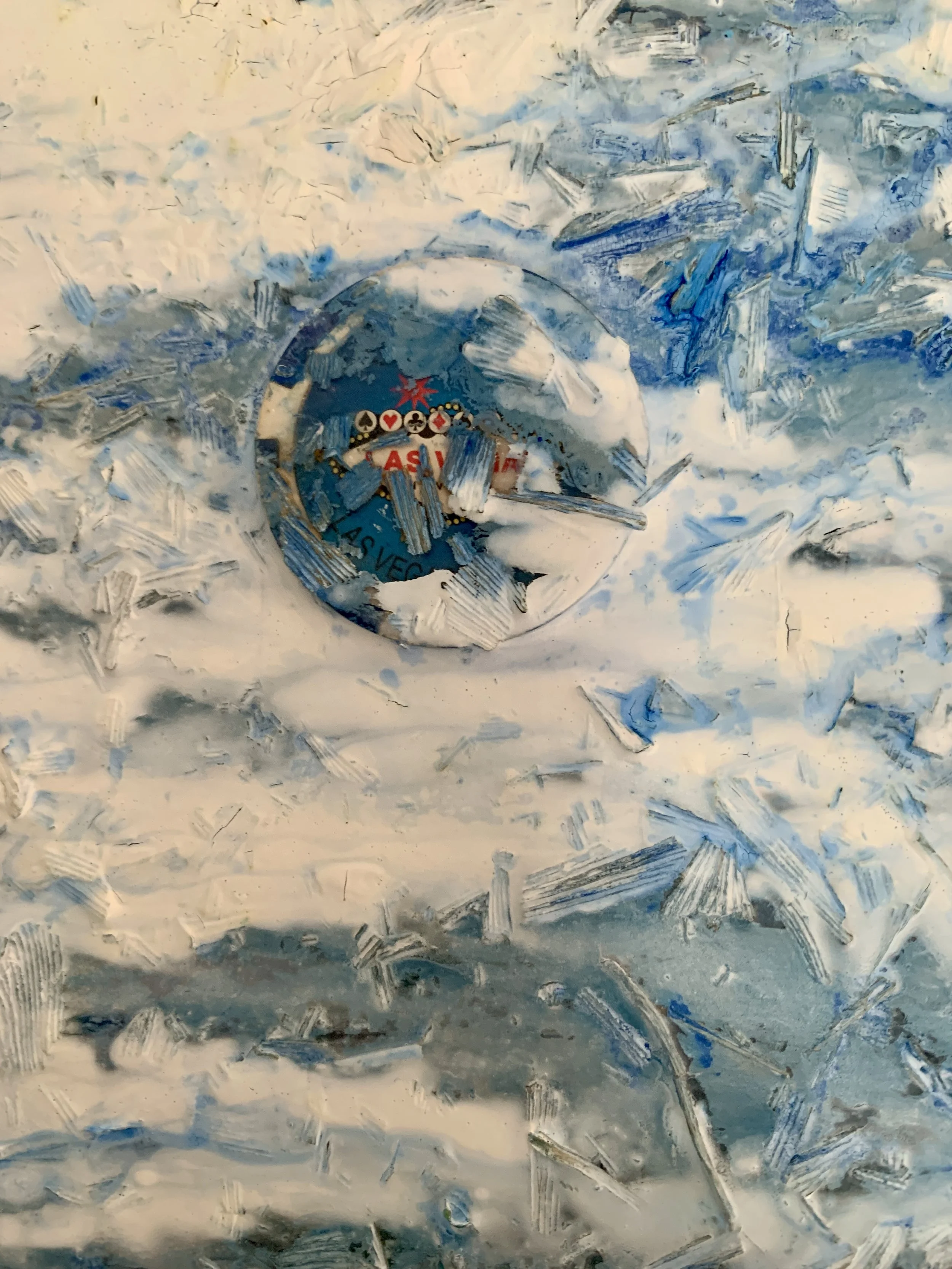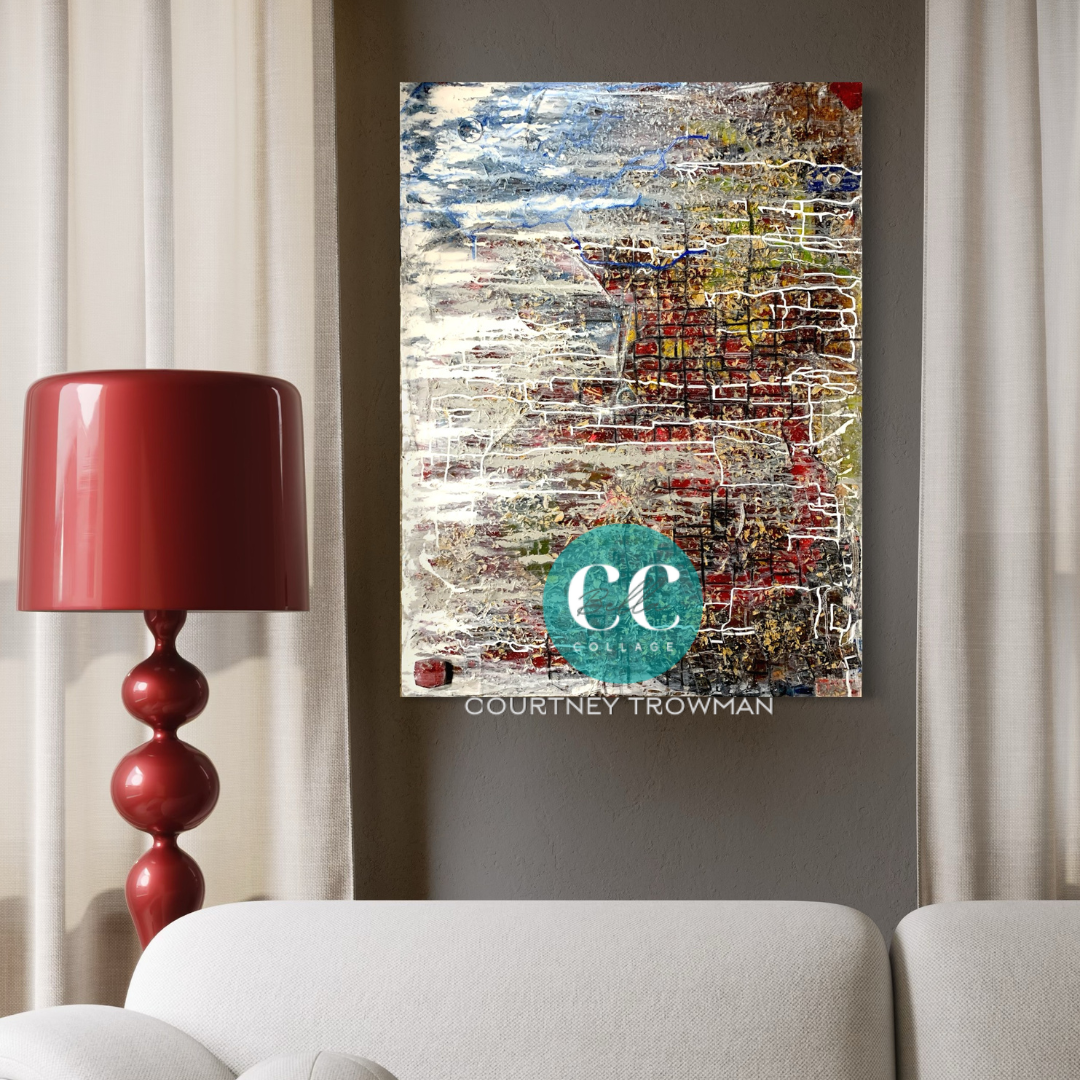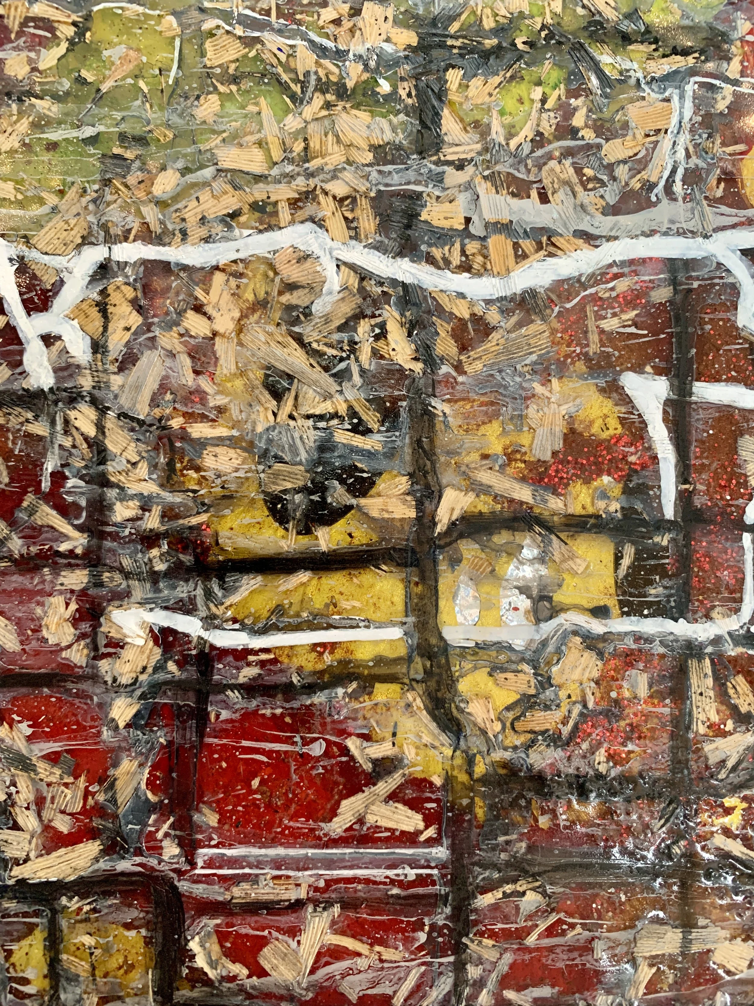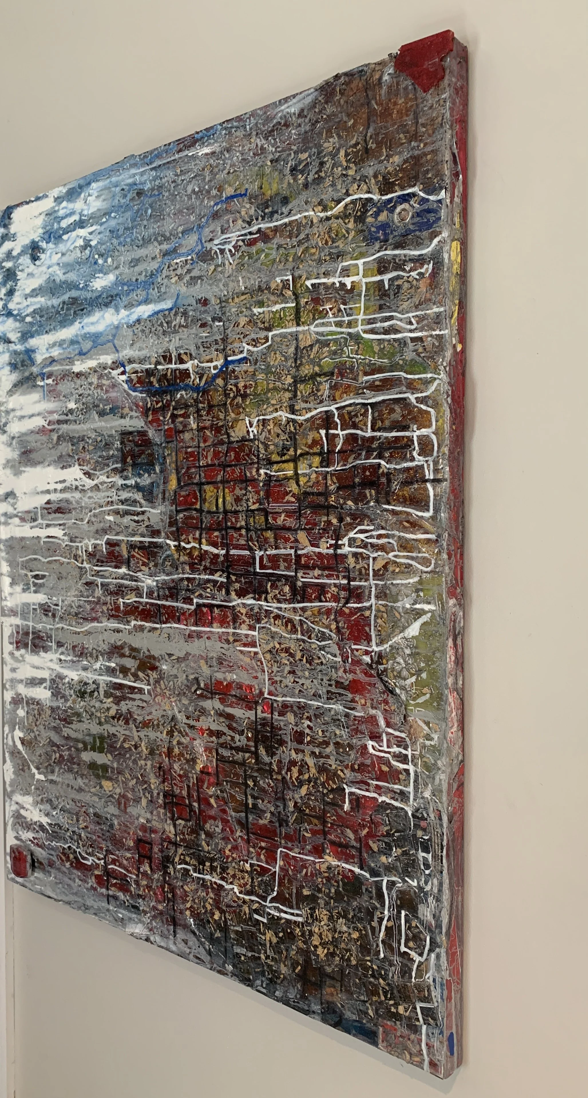 “An evocative abstract that feels both mapped and weathered, this painting layers dense texture, fractured grids, and drifting lines of white and blue over deep reds and earthen tones. It suggests a city seen through time—streets erased and redrawn, memories embedded beneath the surface. Raw, tactile, and quietly kinetic, it invites close looking and personal interpretation.”