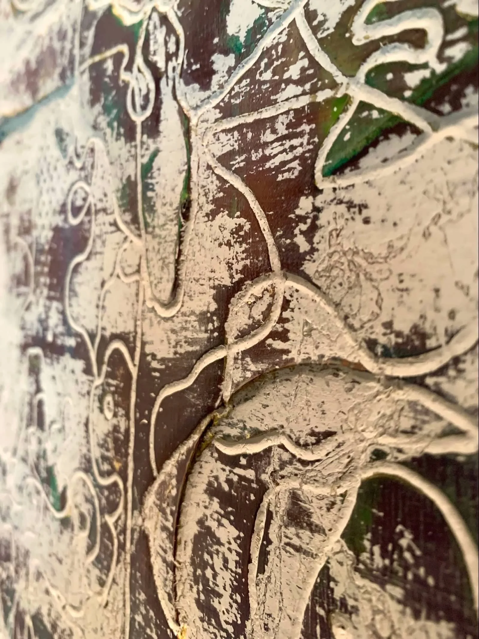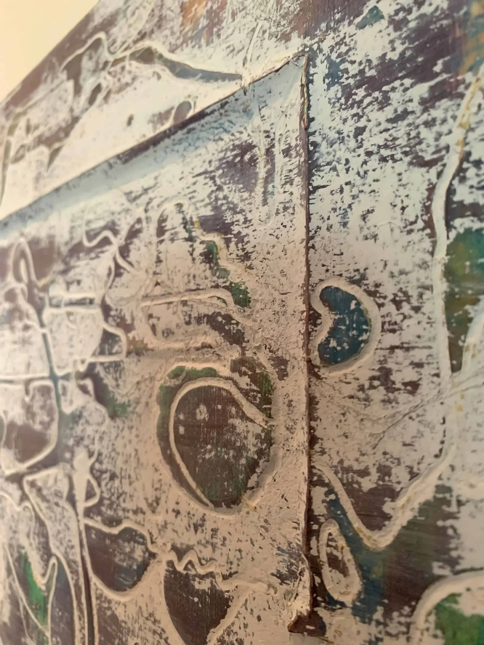 This piece is another example of my deconstruction method. The underlayer colors are rich earthy browns, purples, blues, greens and rust… almost like the color of oil slick. The texture comes from leftover pieces of resin run-off, a meandering (snail) trail of Dremel carvings and pieces of flourescent light covers.