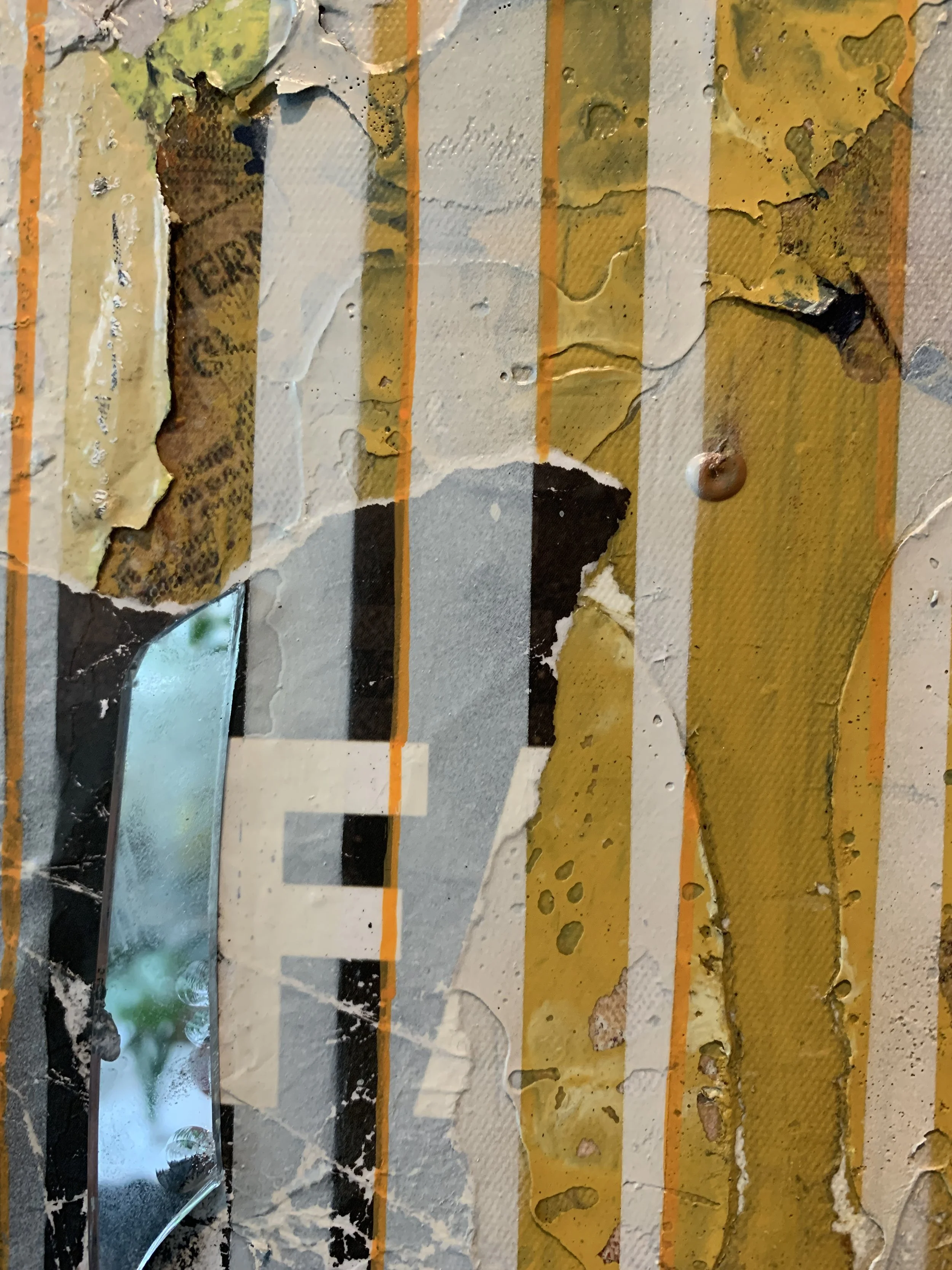 The backstory and background comes from a piece in which I had lost my way. I had a whole section of glued and painted resin scraps that just were not gelling, so I pulled them off …which left behind an incredible gritty and decaying urban texture. Once again, instead of opaquely obscuring the collage elements, I used my graffiti peek-a-boo effect.